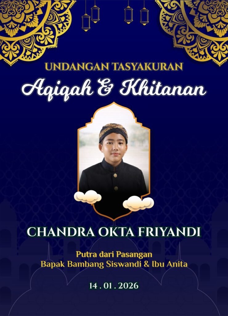 UNDANGAN TASYAKURAN Khitanan Aqila Nadhifa Azzahra Yth. Bapak / Ibu / Saudara/i Buka Undangan Kami mengundang Bapak/Ibu/Saudara/i untuk berhadir pada acara Tasyakuran Khitan anak kami. Assalamualaikum Wr. Wb. Dengan memohon rahmat & ridha Allah SWT. Kami bermaksud menyelenggarakan acara Khitan putri kami. Dan Kami mengundang Bapak/Ibu/Saudara/i untuk berhadir pada acara Tasyakuran Khitan Putri Kami. Aqila …